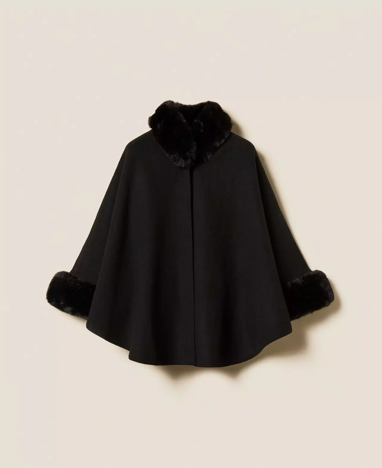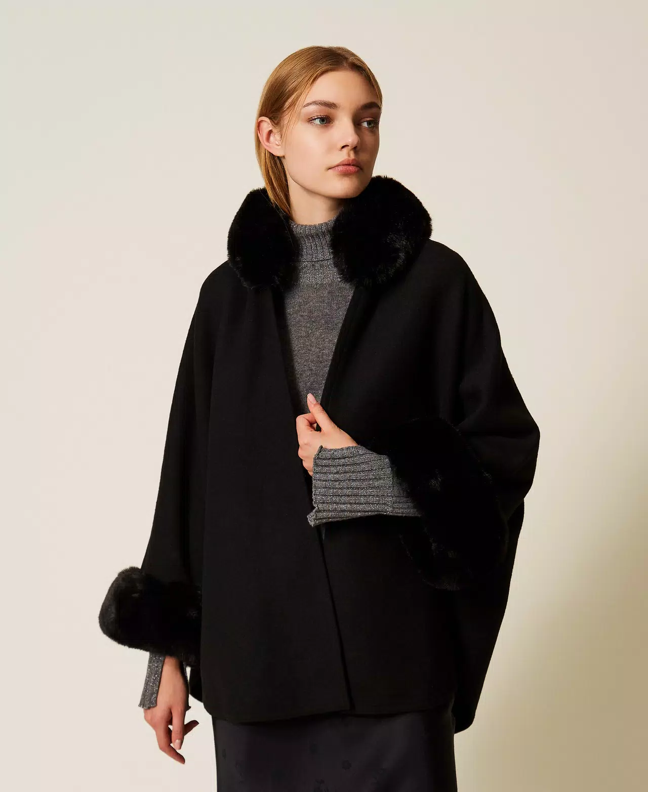 Poncho in panno con collo e polsi in pelliccia sintetica. Ha chiusura con gancio al collo e maniche lunghe.