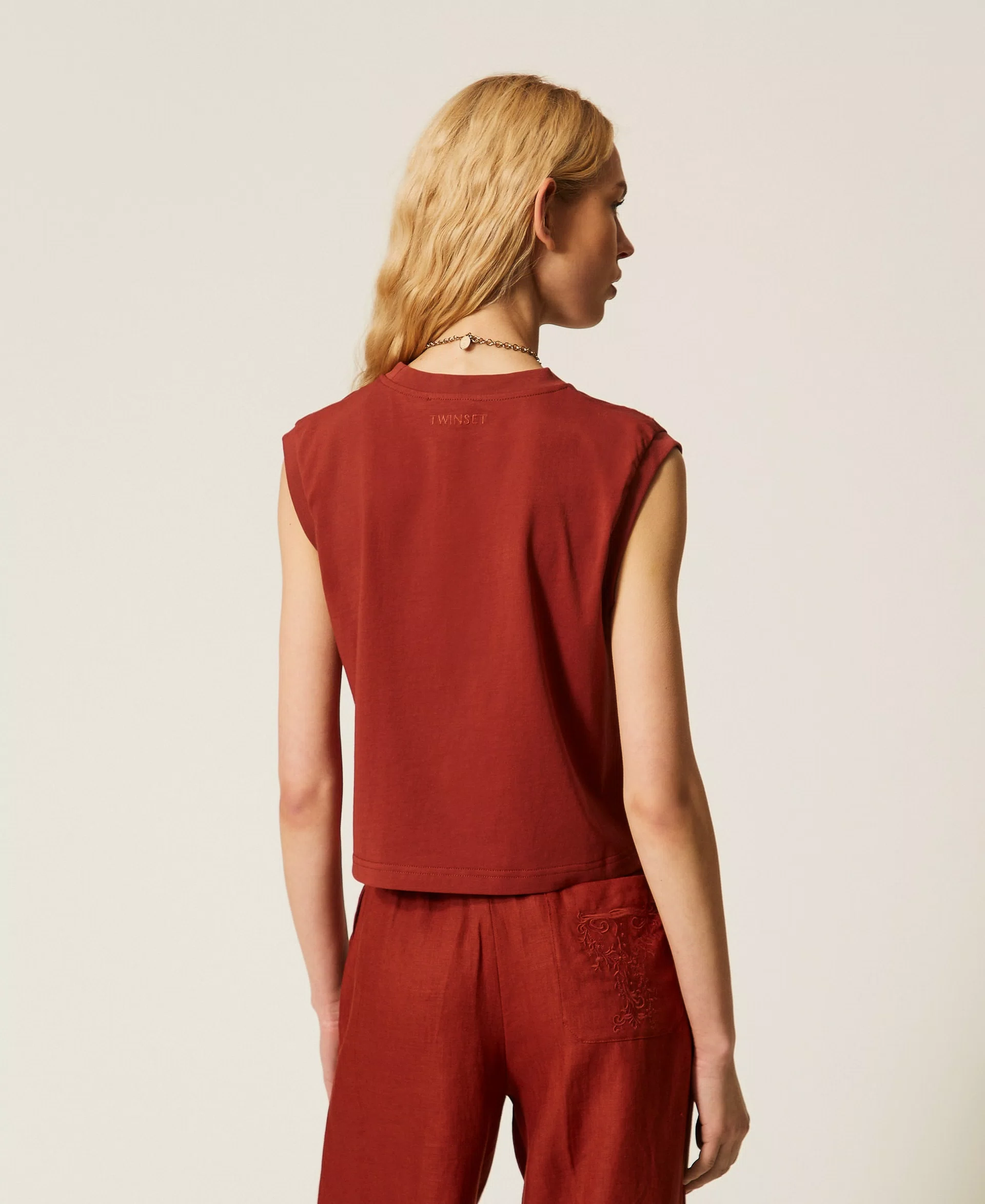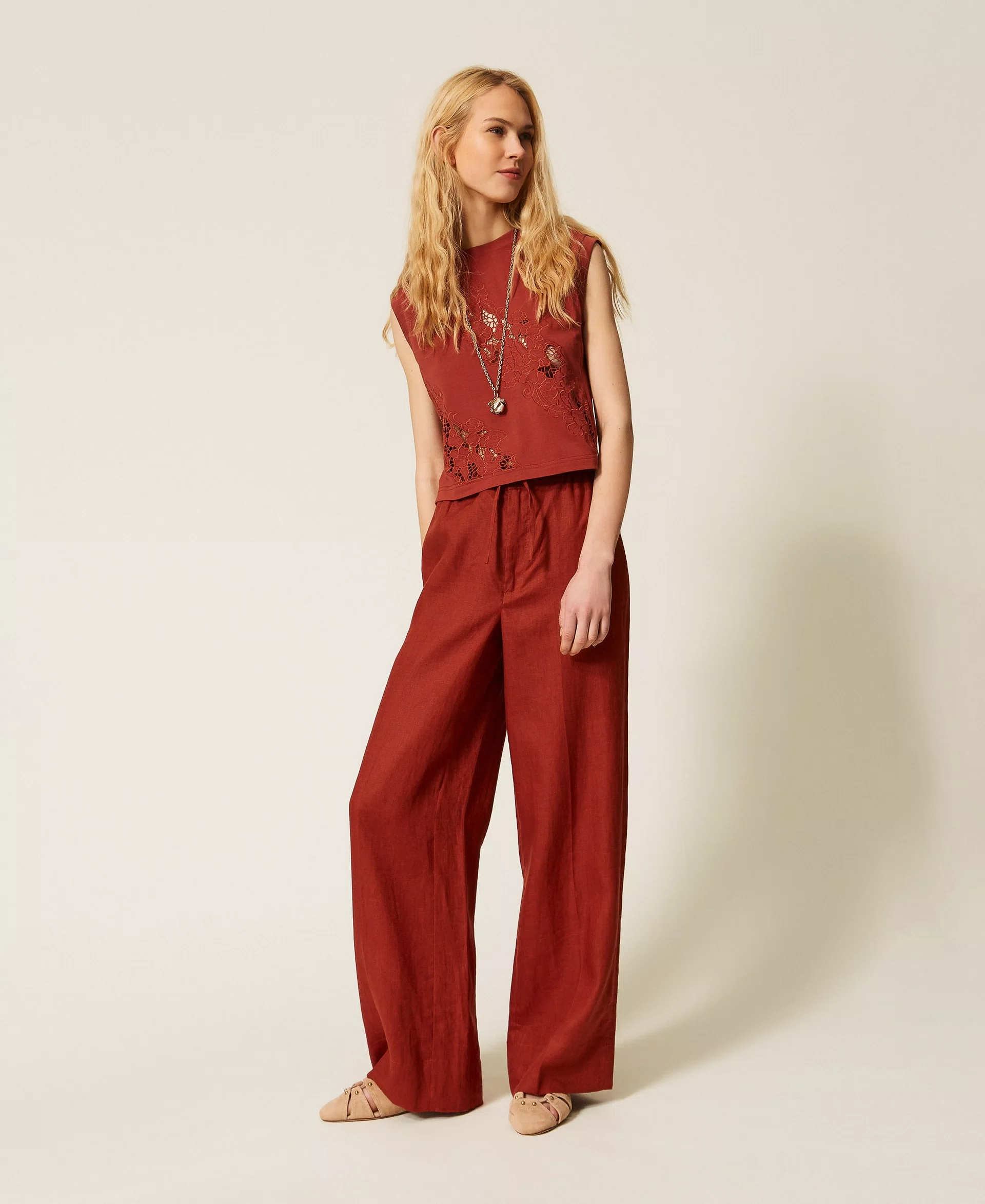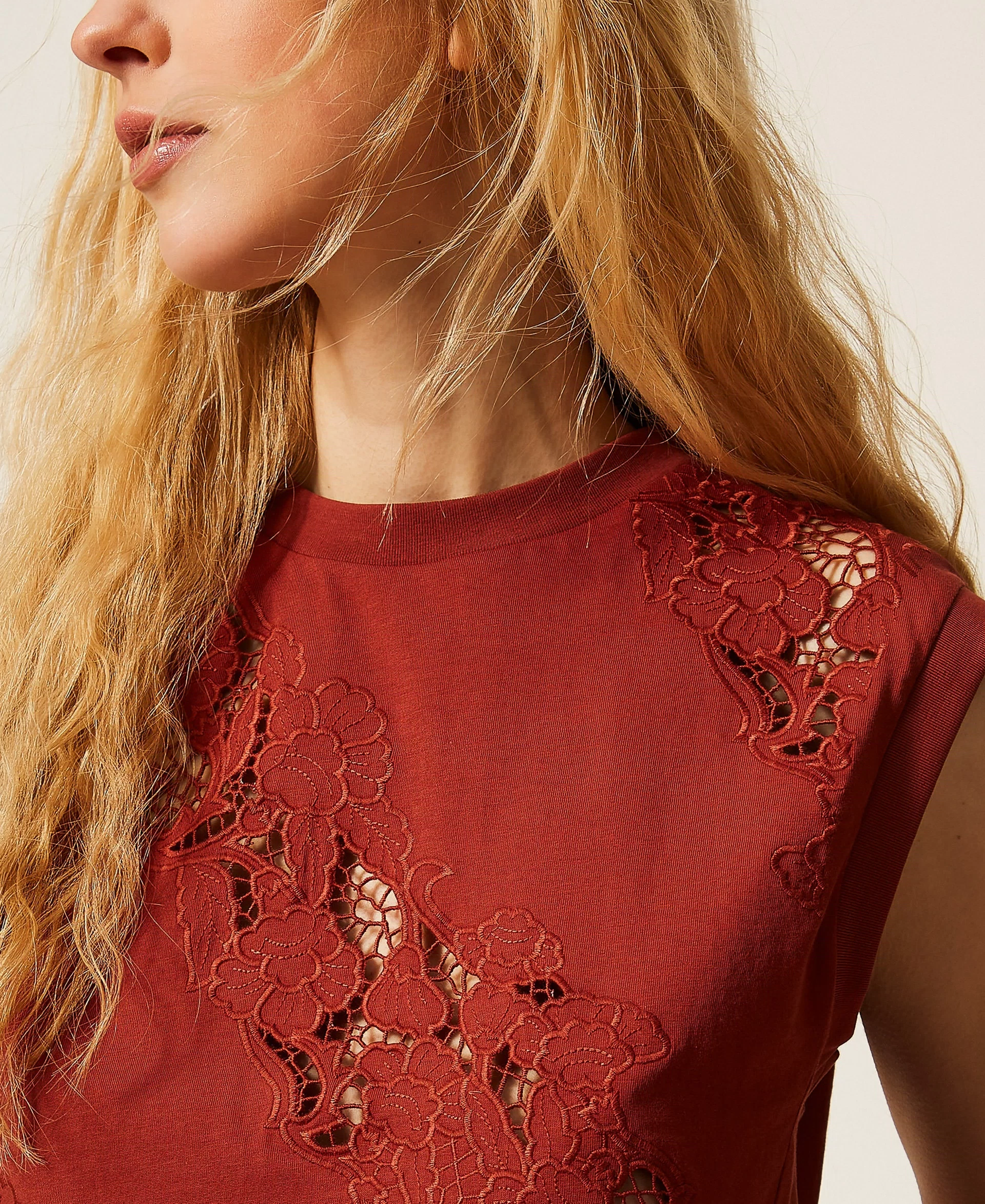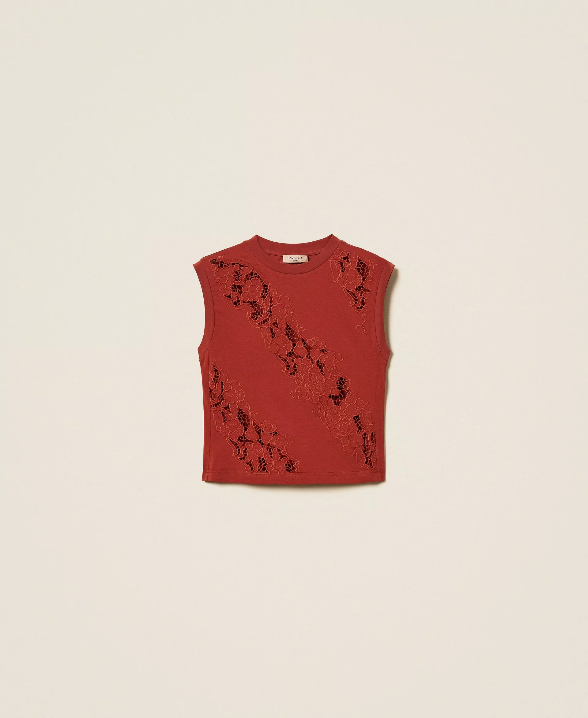 T-shirt in jersey di puro cotone con ricamo sangallo inserito in bande diagonali. Ha collo tondo, placchetta logo sul retro, linea regular