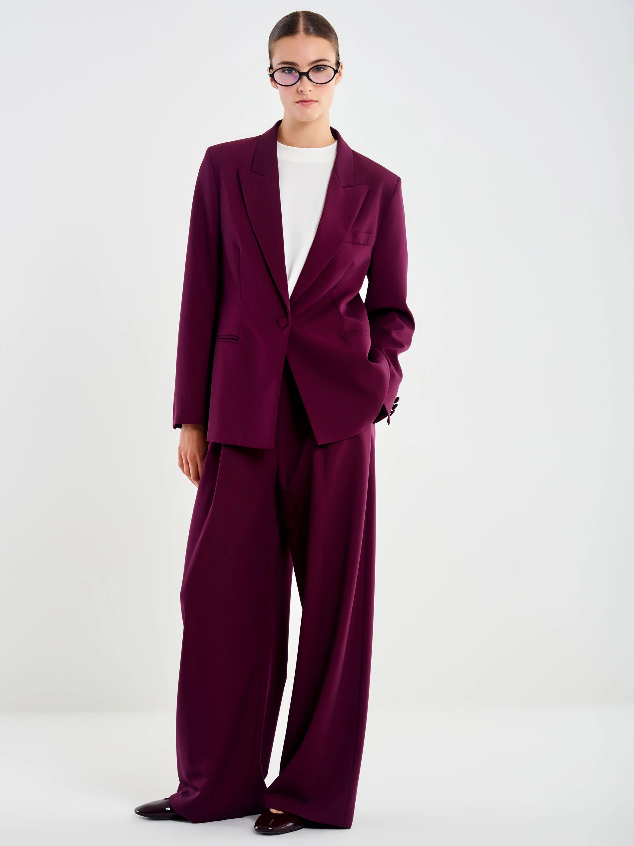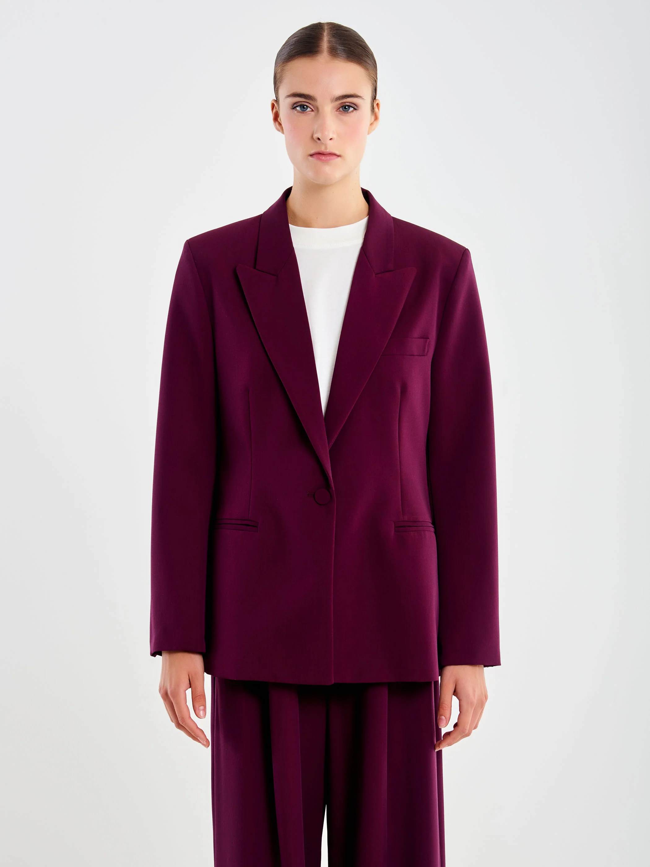 Blazer con collo a revers e maniche lunghe. Tasche frontali a filetto. Spacco posteriore. Chiusura frontale con un bottone. Sfiancato in vita.