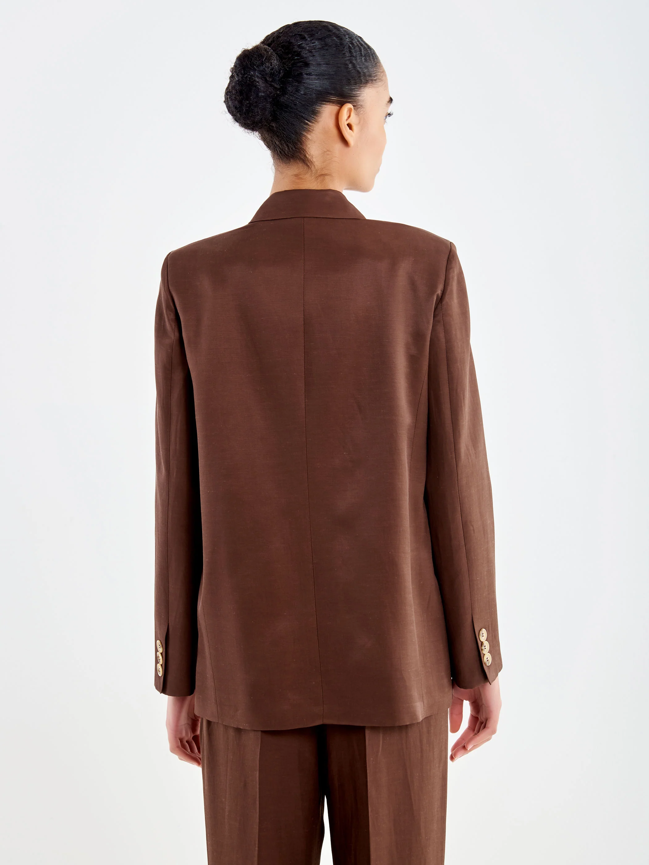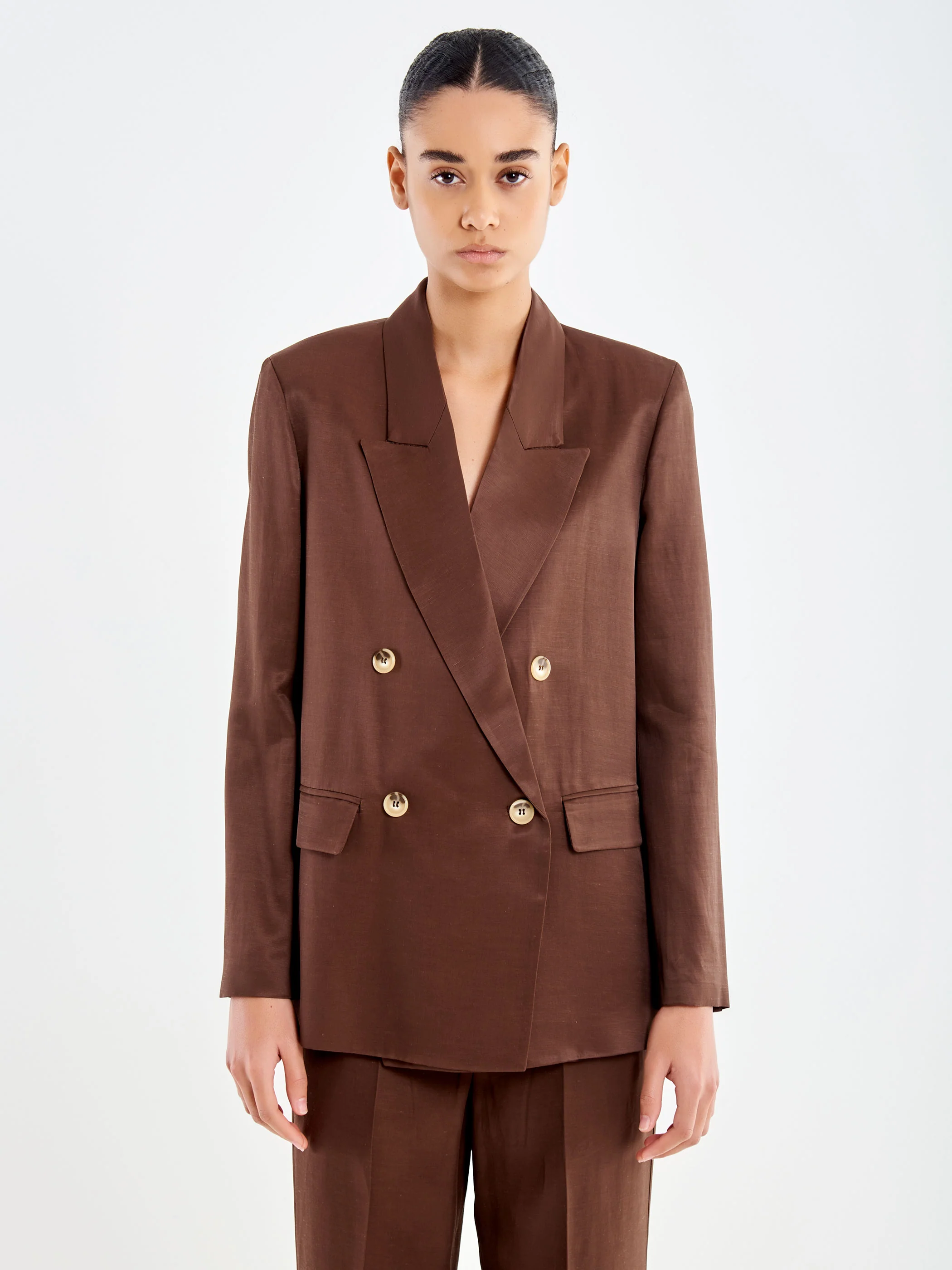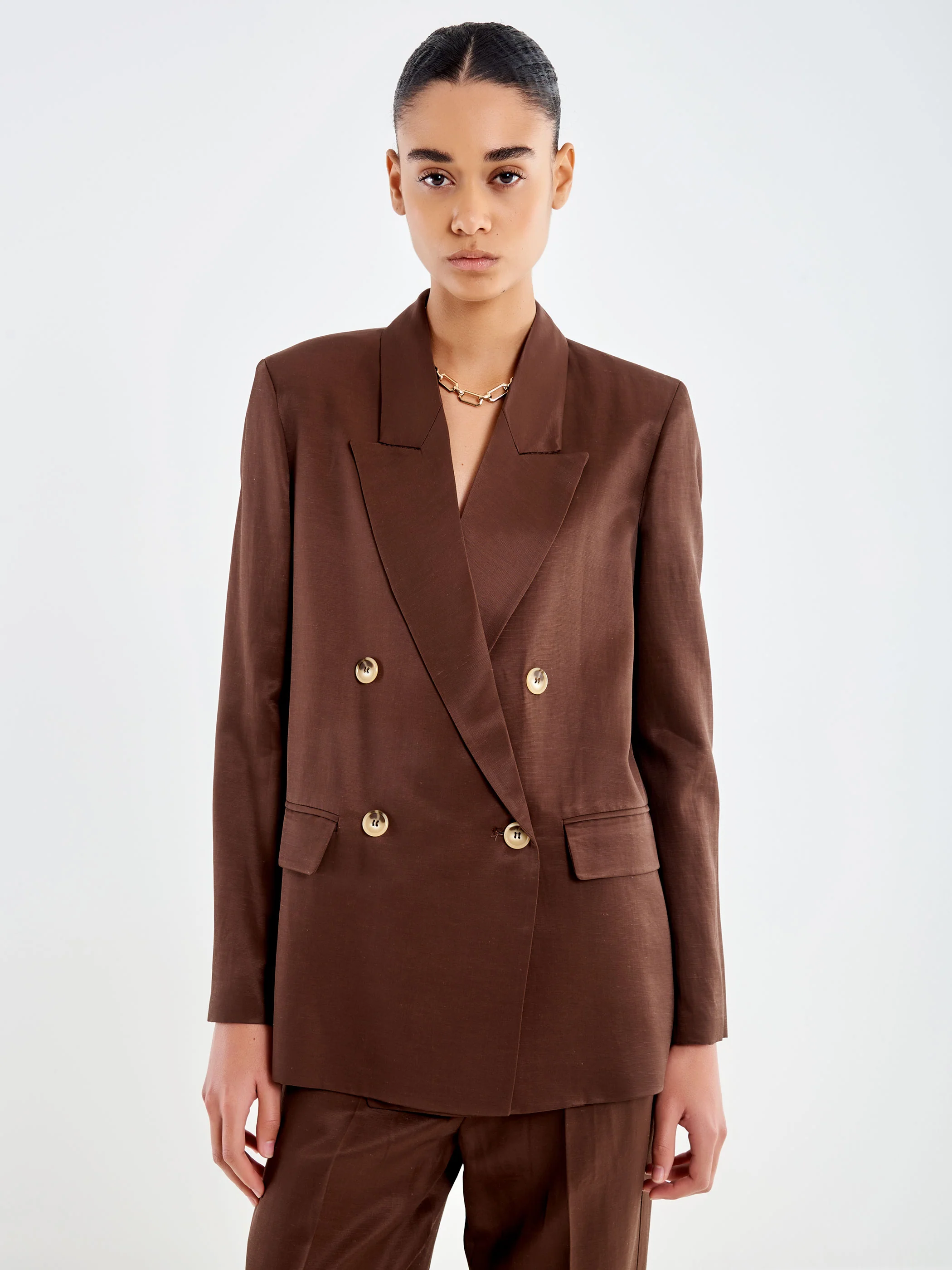 Blazer con collo revers a lancia. Maniche lunghe con bottoni sui polsi. Tasche frontali con patta. Chiusura frontale a doppiopetto con bottoni.