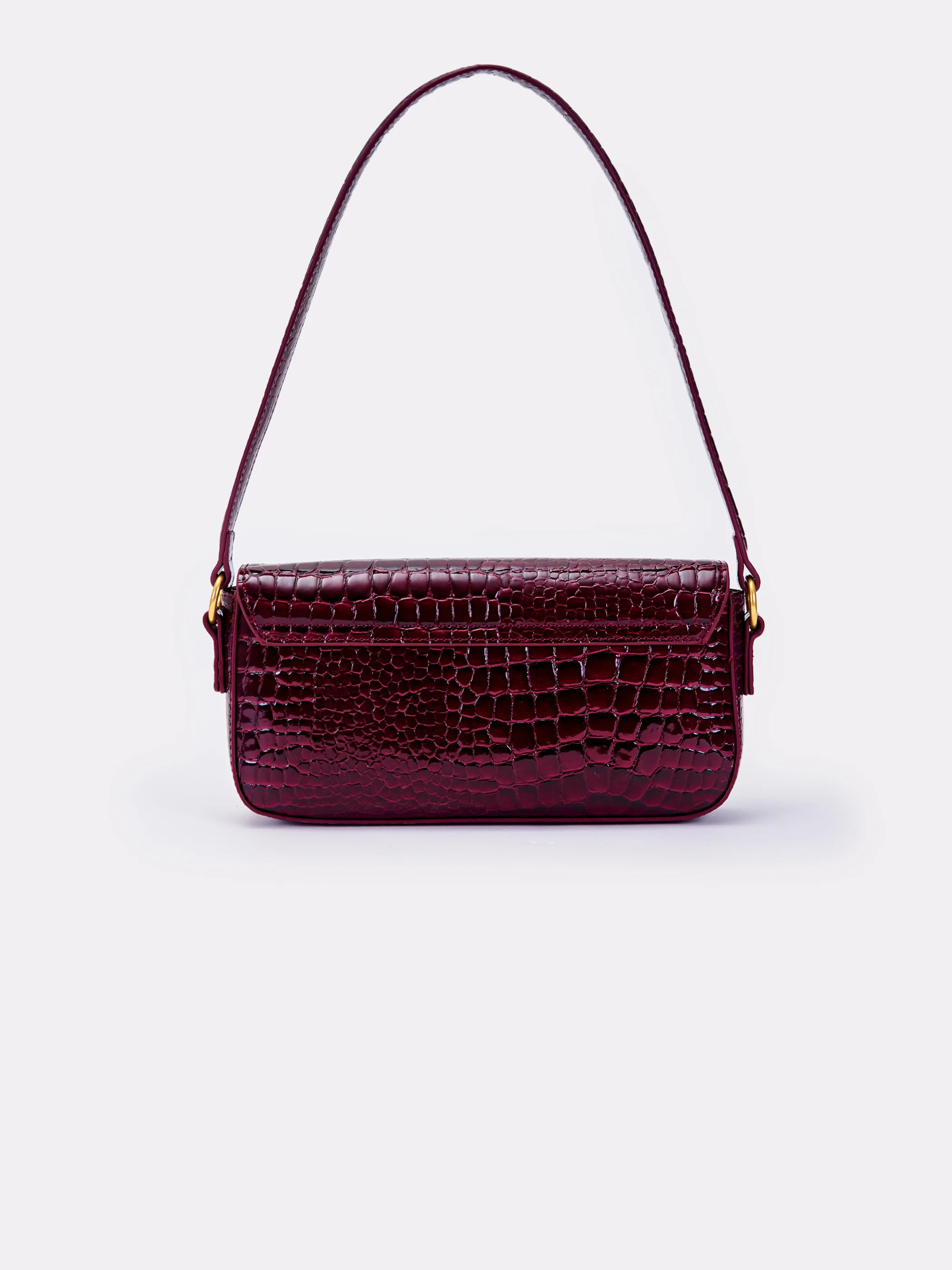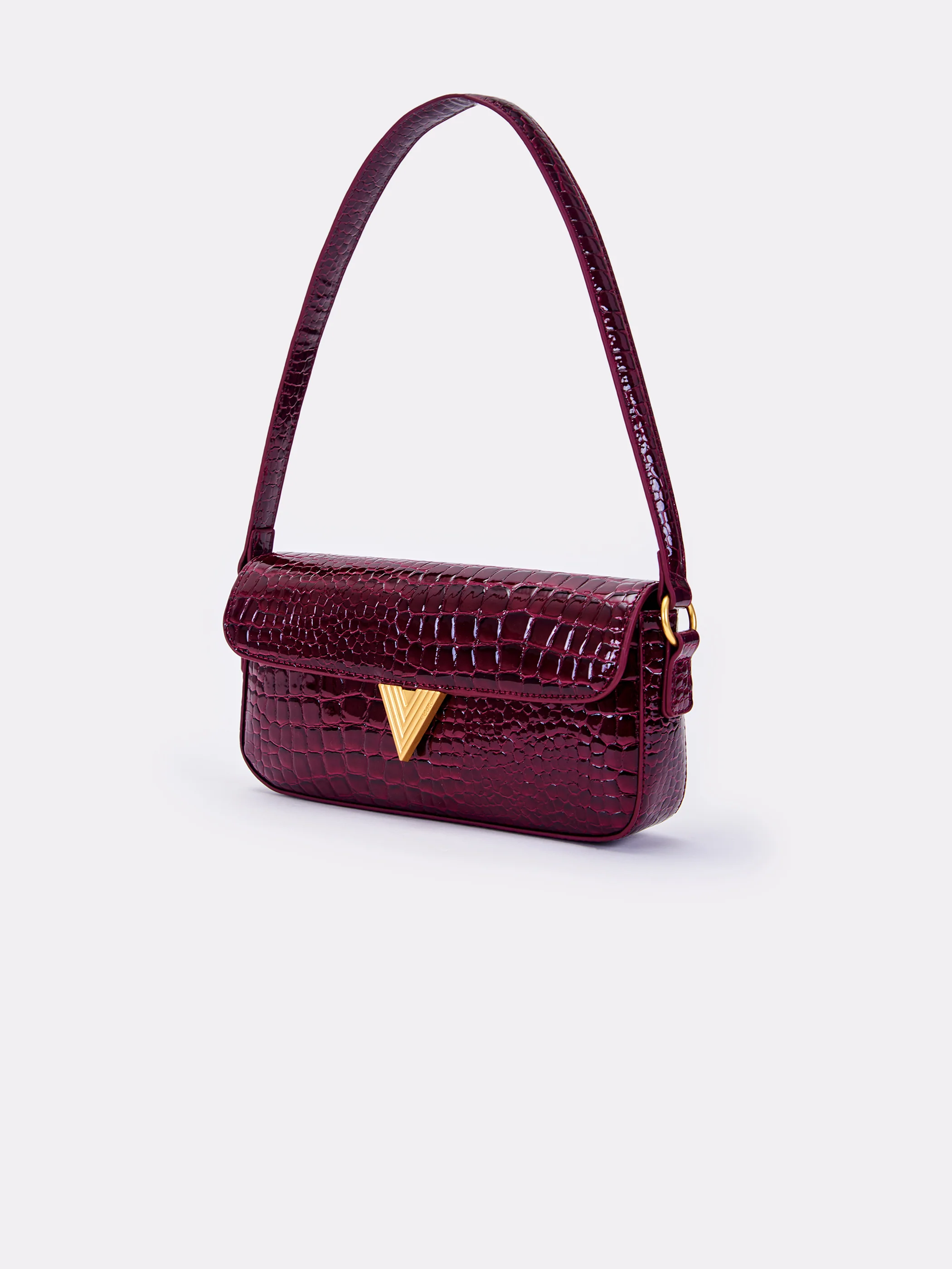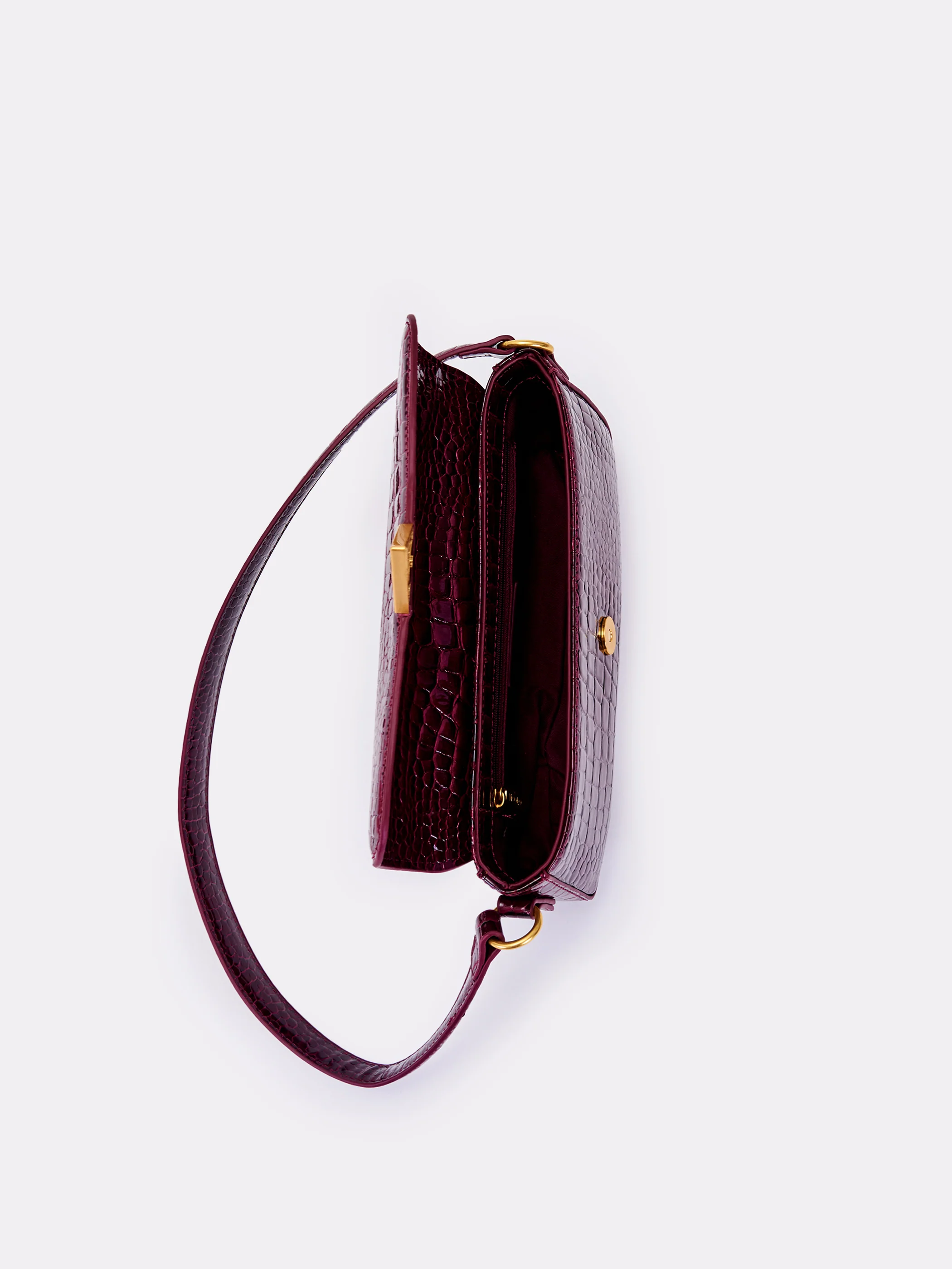 Borsa Pencil a spalla in ecopelle effetto "coco" in vernice . Tracolla in similpelle rigida. Chiusura con bottone a pressione con calamita. Dettaglio logo metal plate Vicolo. Finiture anticate color oro. Tasca interna con cerniera e taschina piatta.