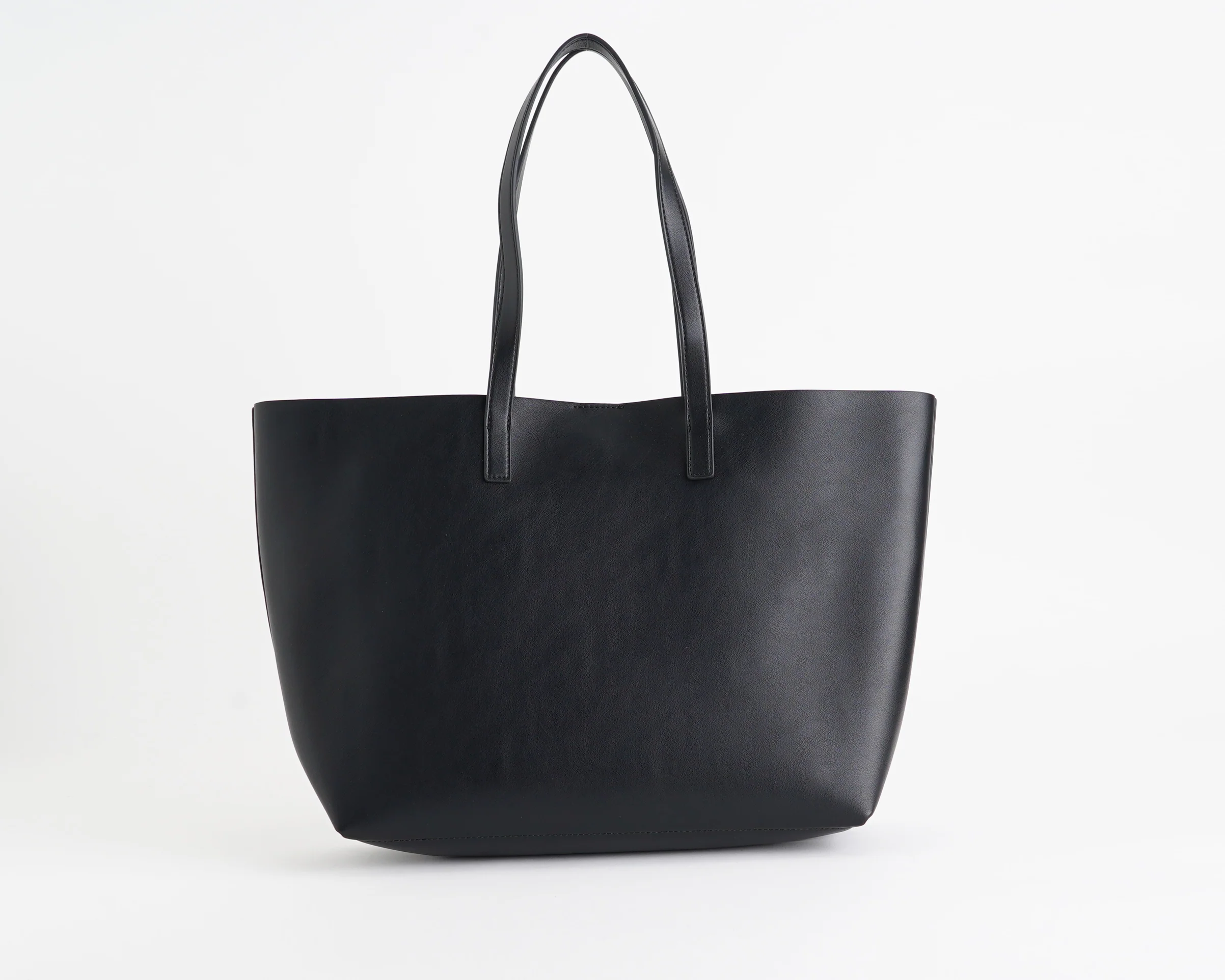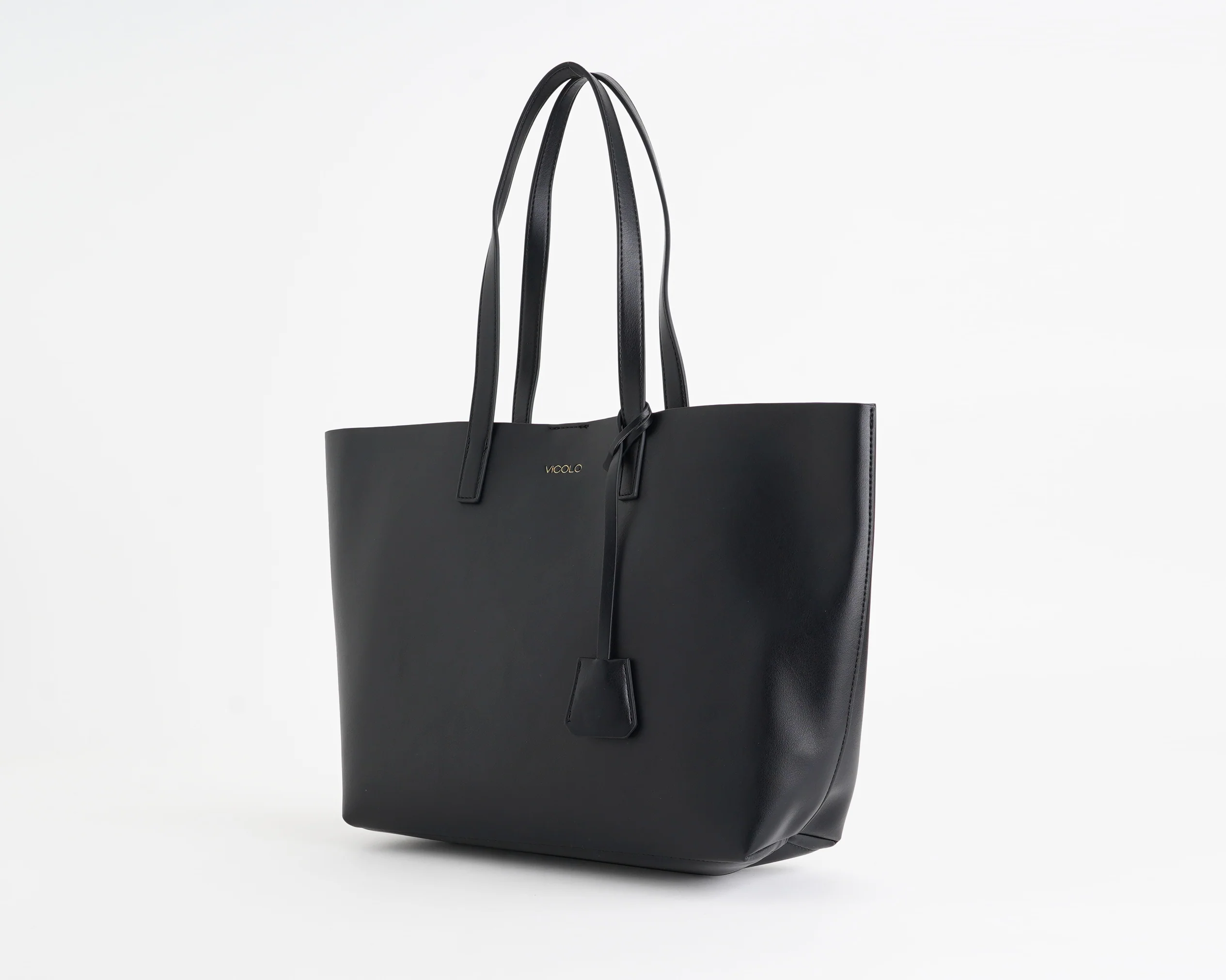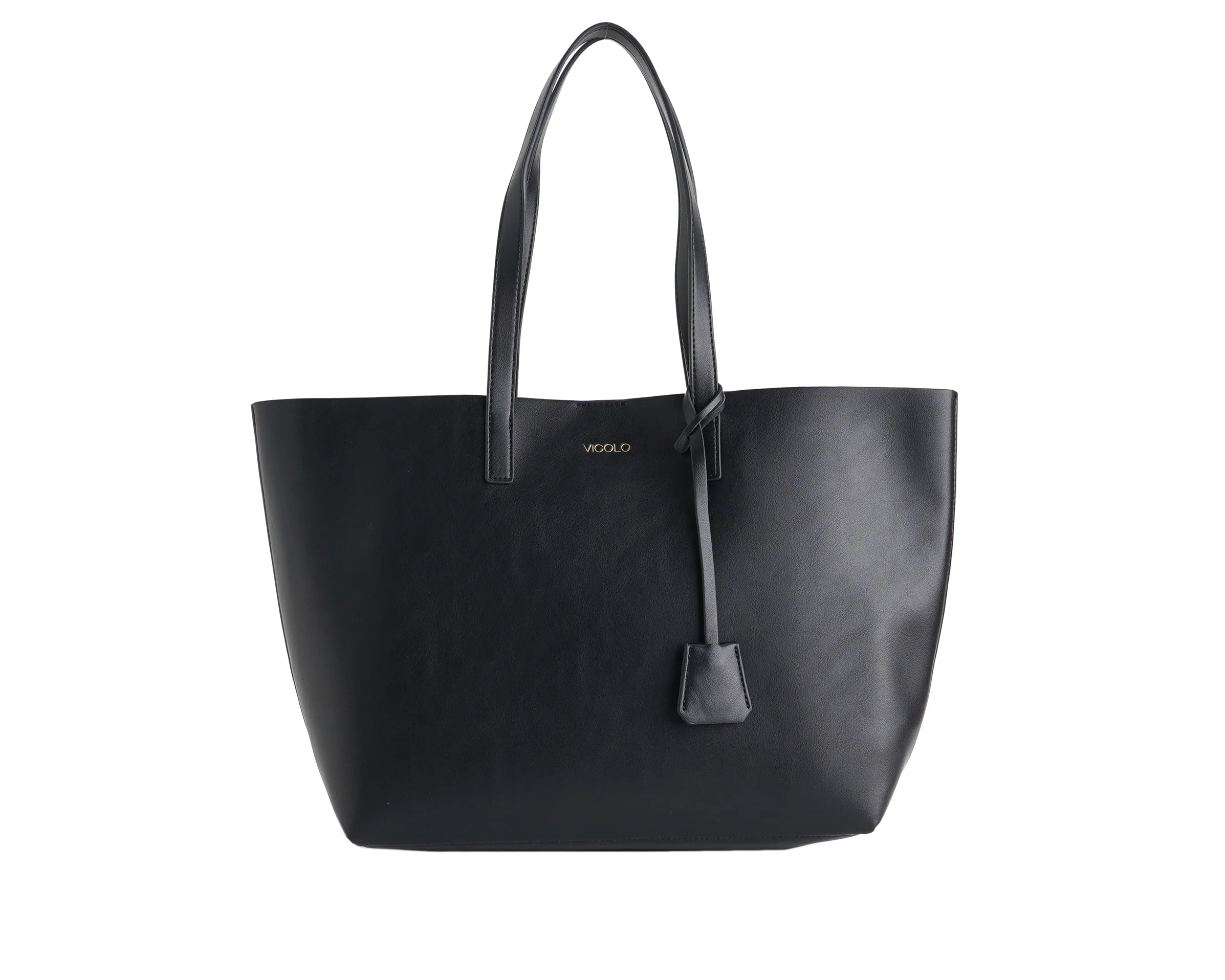 Borsa Vicolo, colore nero, tessuto in ecopelle, modello shopper, manici rigidi a spalla, chiusura con bottone automatico, pochette interna, logo frontale