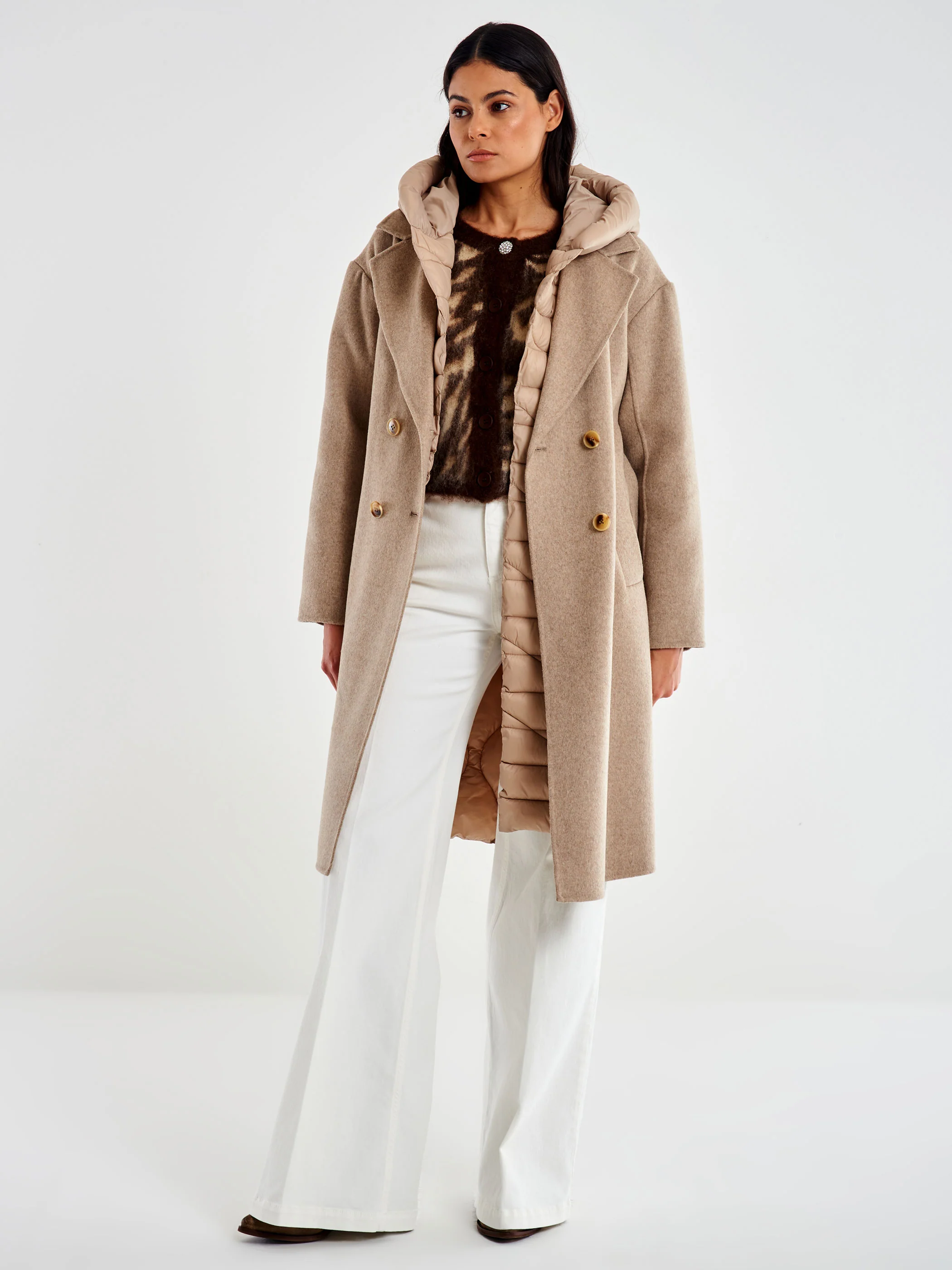Cappotto midi con cintura combinato. Dettaglio fronte e maniche in panno. Retro ed interno con cappuccio in piumino. Chiusura frontale doppiopetto con revers con bottoni tartarugati con cintura. Dettaglio tasche a filetto.