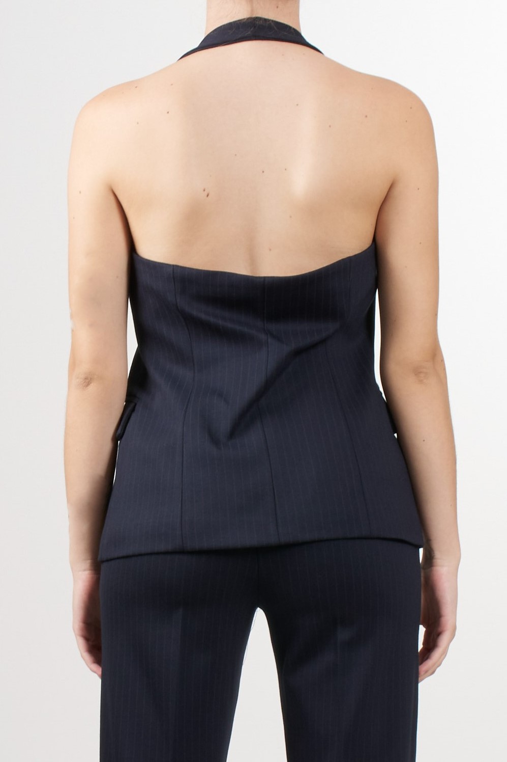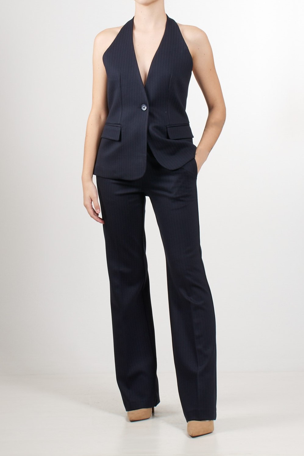 Gilet Vicolo con profonda scollatura all'americana, caratterizzato da una silhouette aderente e una chiusura a un solo bottone frontale, motivo gessato tono su tono, tasche con patta. perfetto da abbinare al pantalone e alla giacca coordinato per un completo sofisticato.