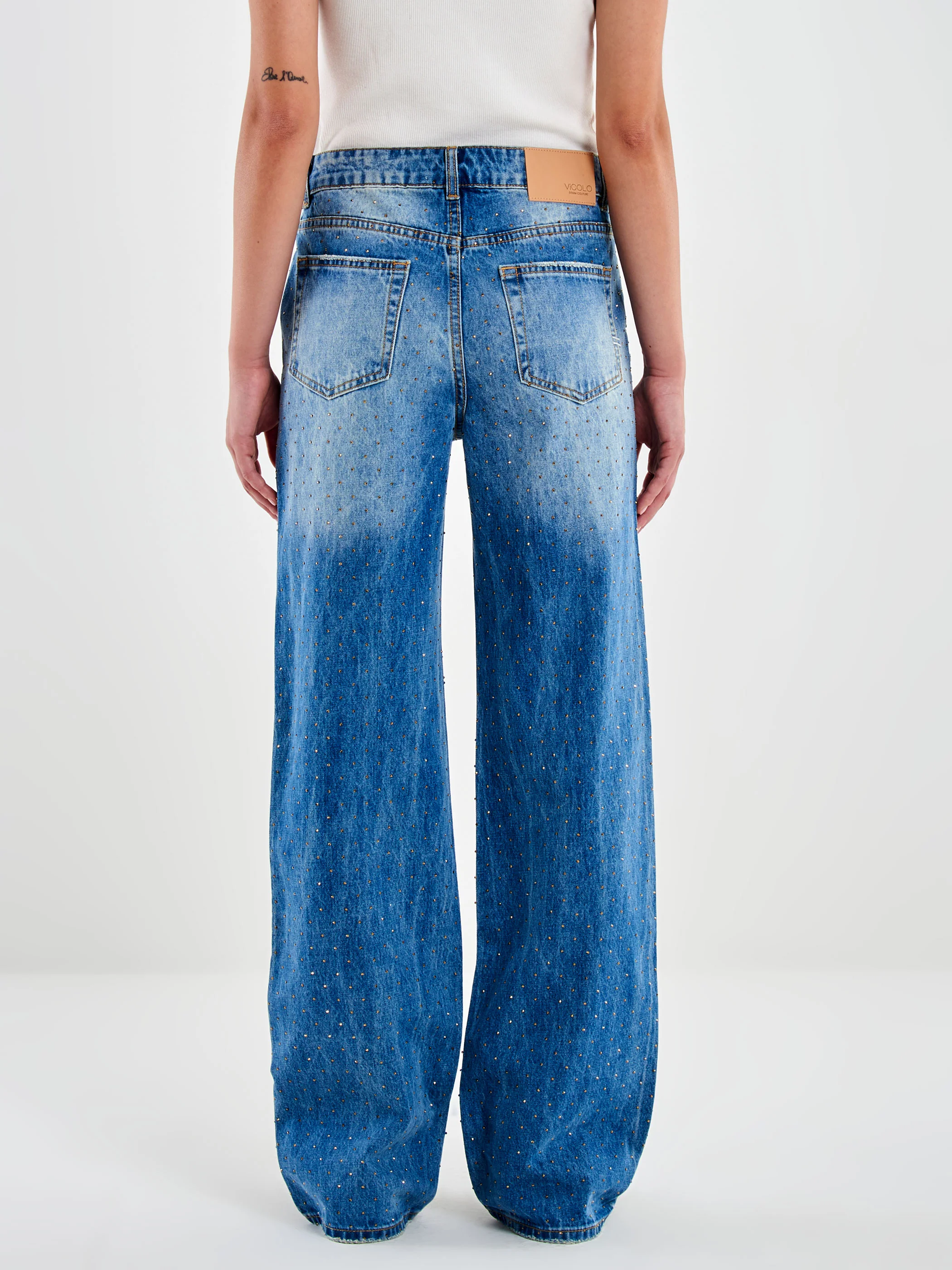 Jeans a vita alta con gamba dritta e fit regular. Modello cinque tasche. Chiusura frontale con zip e bottone. Dettaglio strass e borchiette dorati applicati sul fronte.