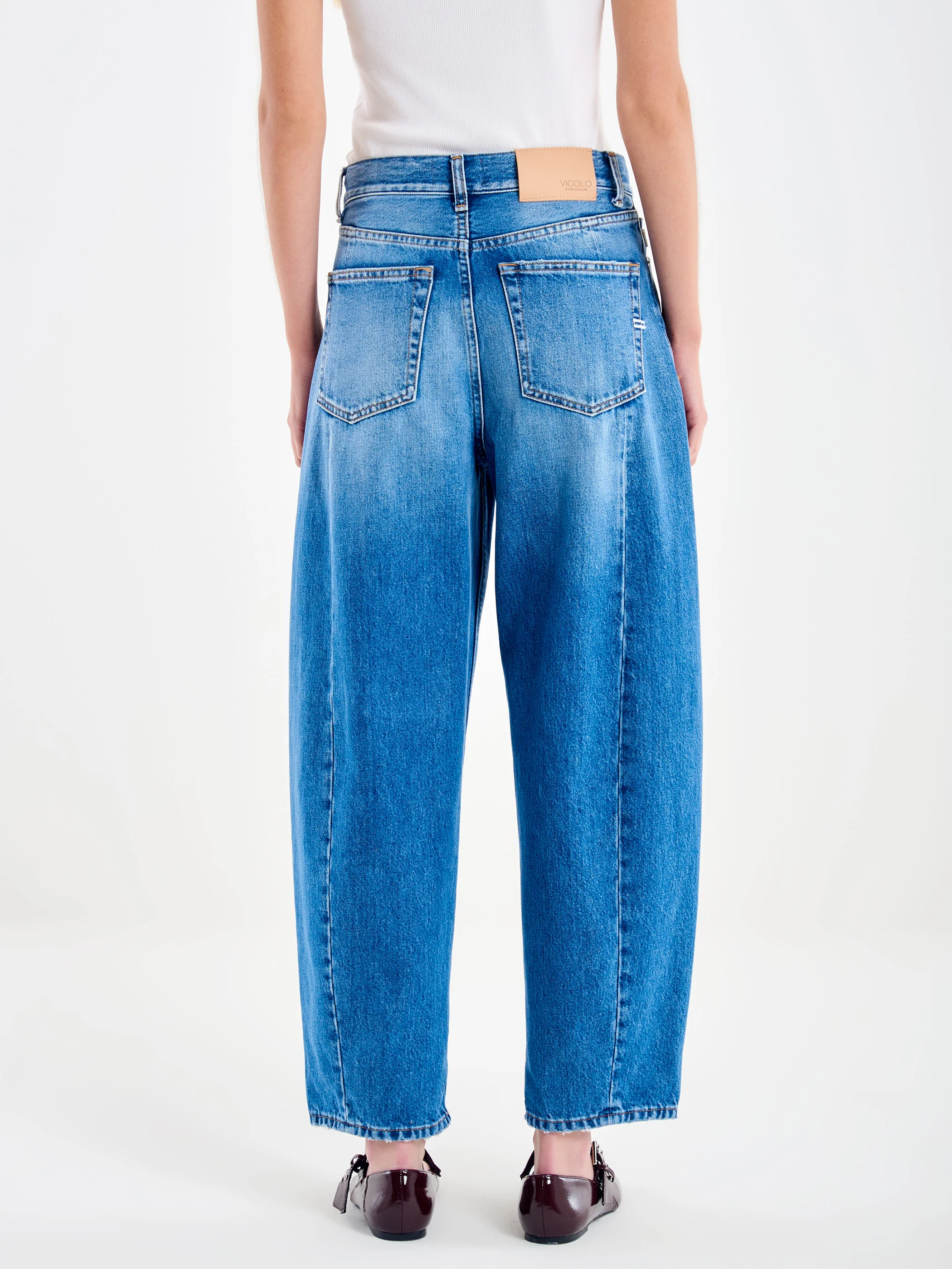 Jeans Chiara Barrel fit vita media. Chiusura frontale con zip e bottone in metallo. Modello cinque tasche, a ovetto. Denim blu. Dettaglio cucitura sulla gamba.