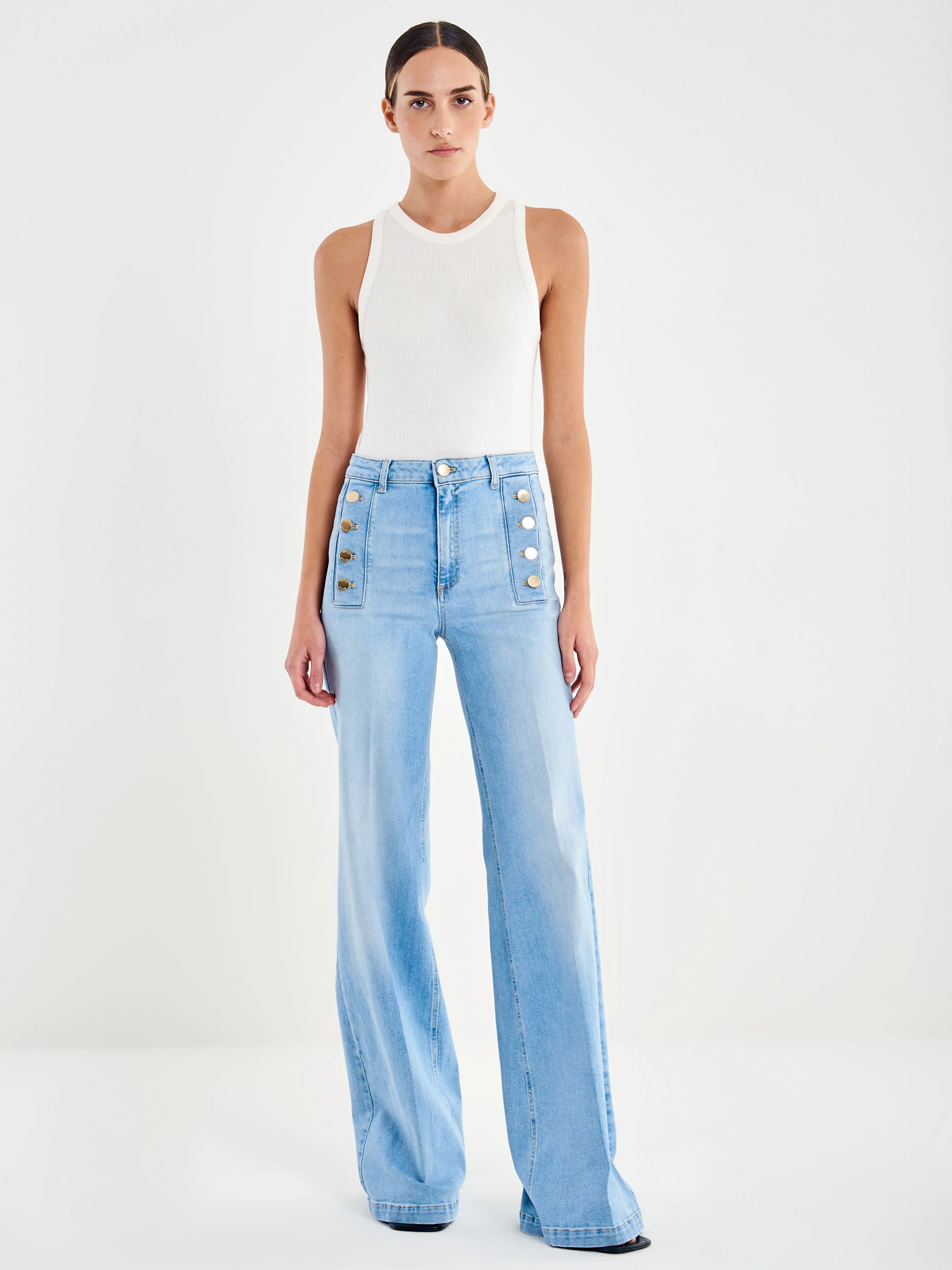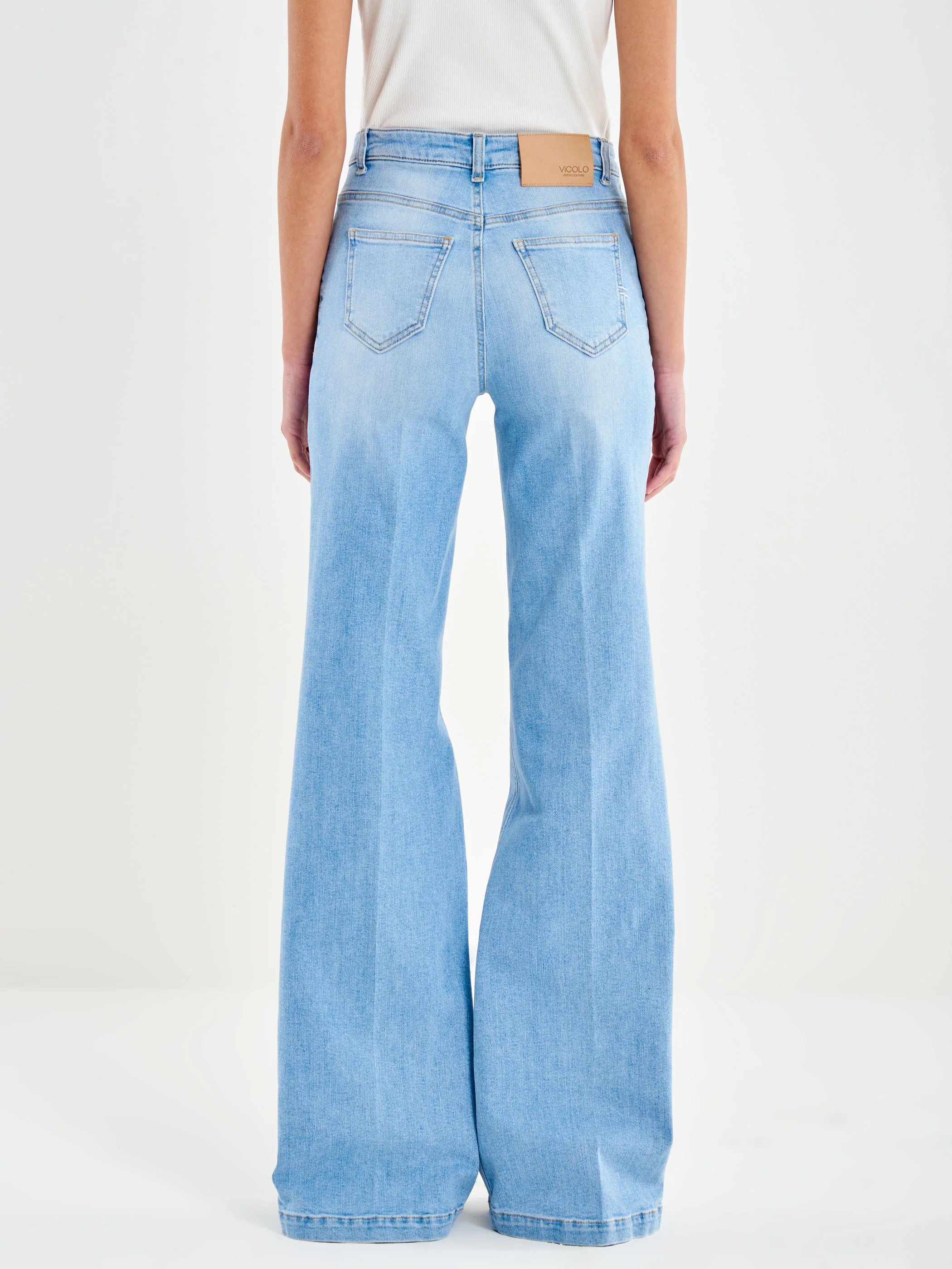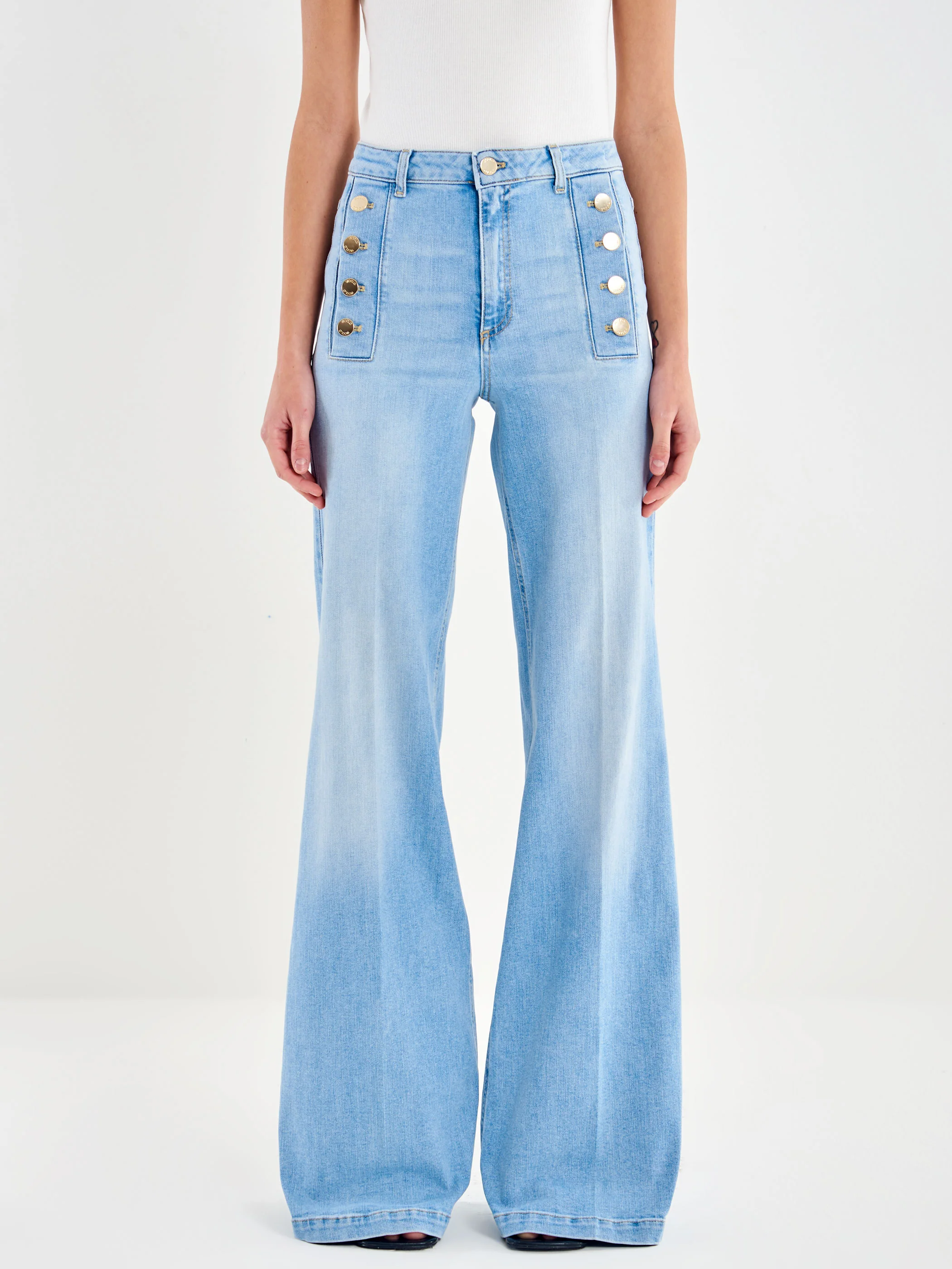 Jeans Giudith a vita alta, wide leg. Chiusura frontale con zip e bottone in metallo. Denim chiaro. Dettaglio bottoni oro sulle tasche e piega centrale frontale e posteriore sulla gamba.