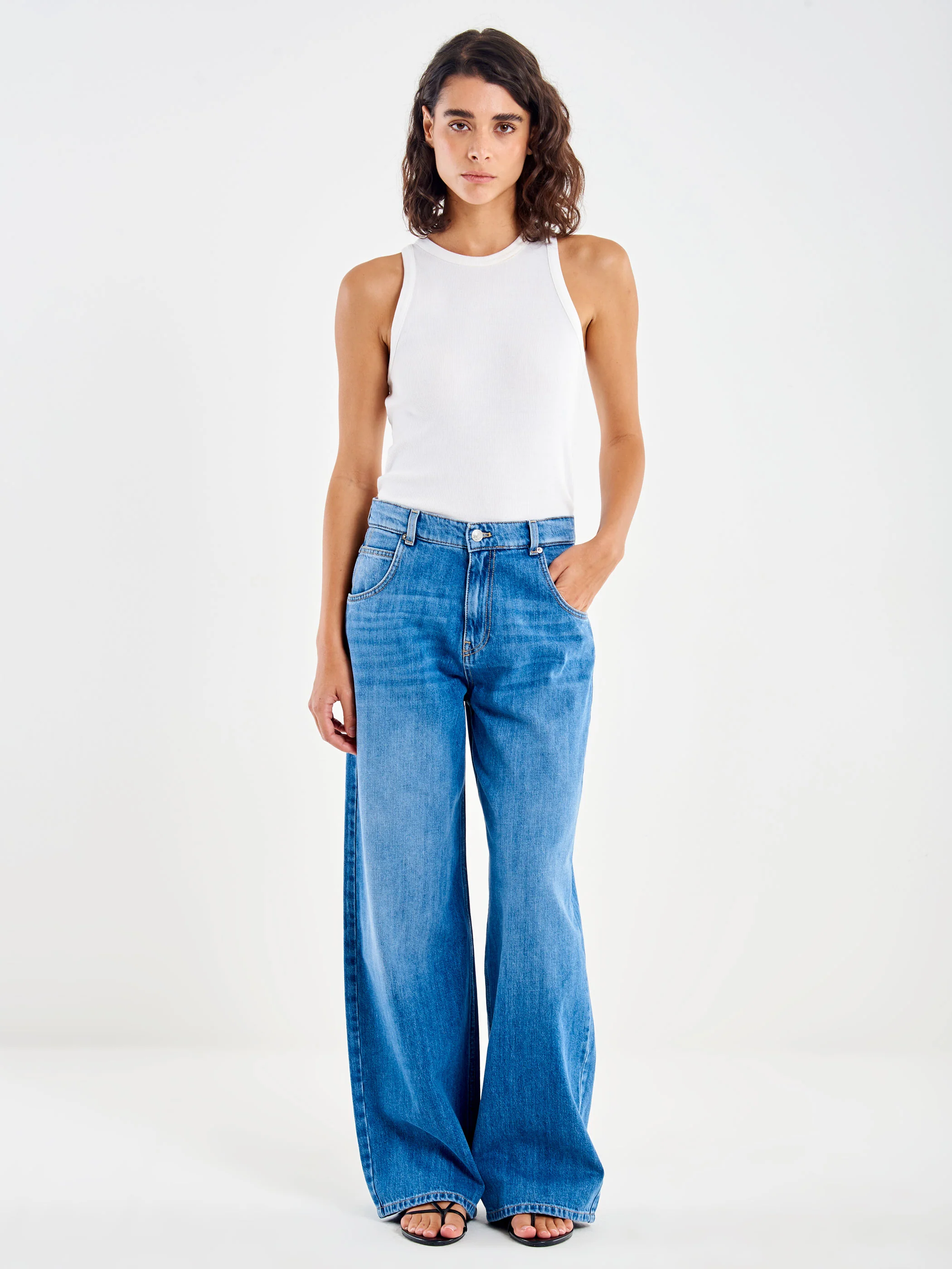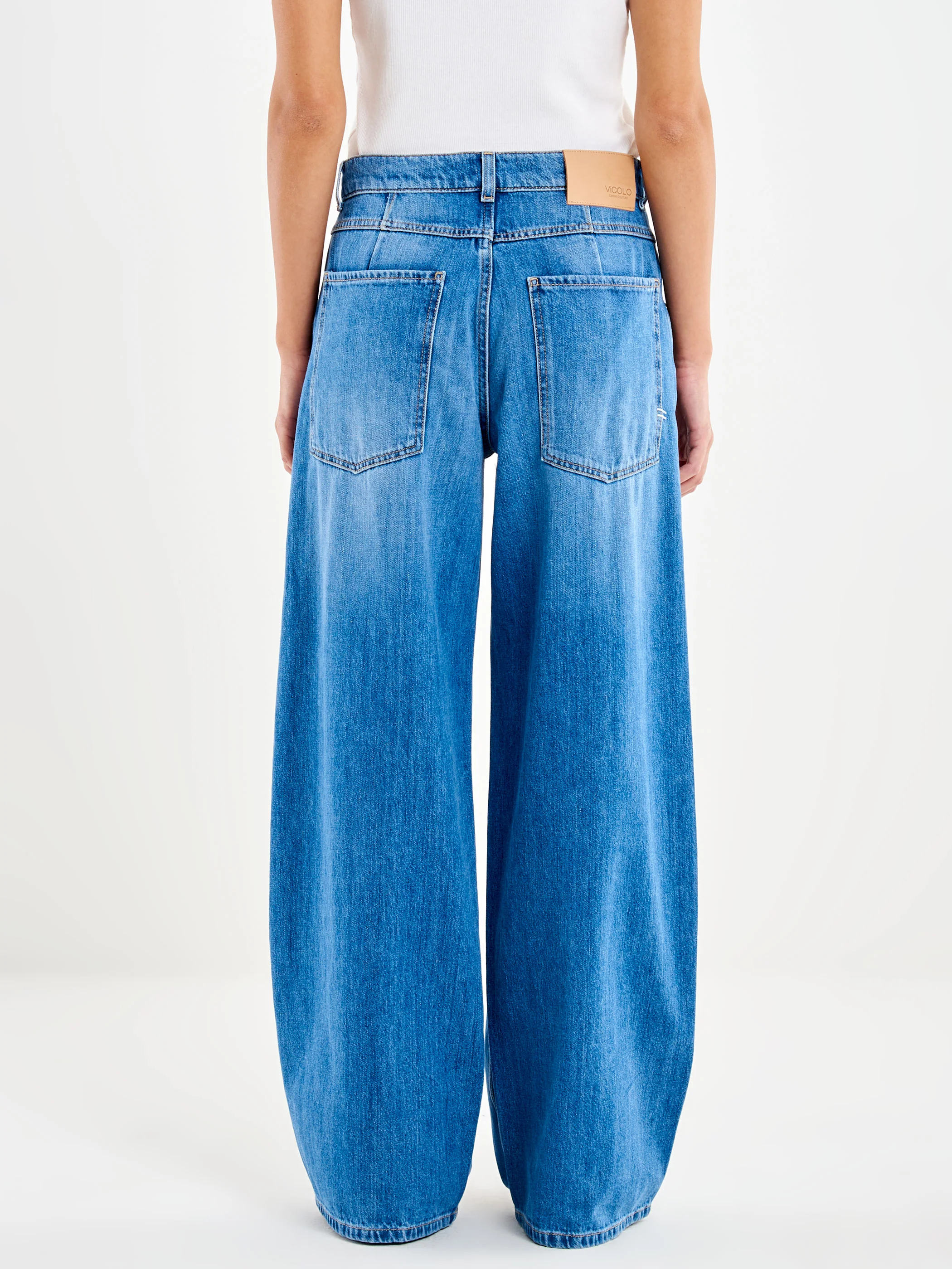 Jeans Icon Mia ampio modello cinque tasche. Chiusura frontale con zip e bottone in metallo. Vita media, gamba ampia. Denim Blu Vintage. Baggy Fit.