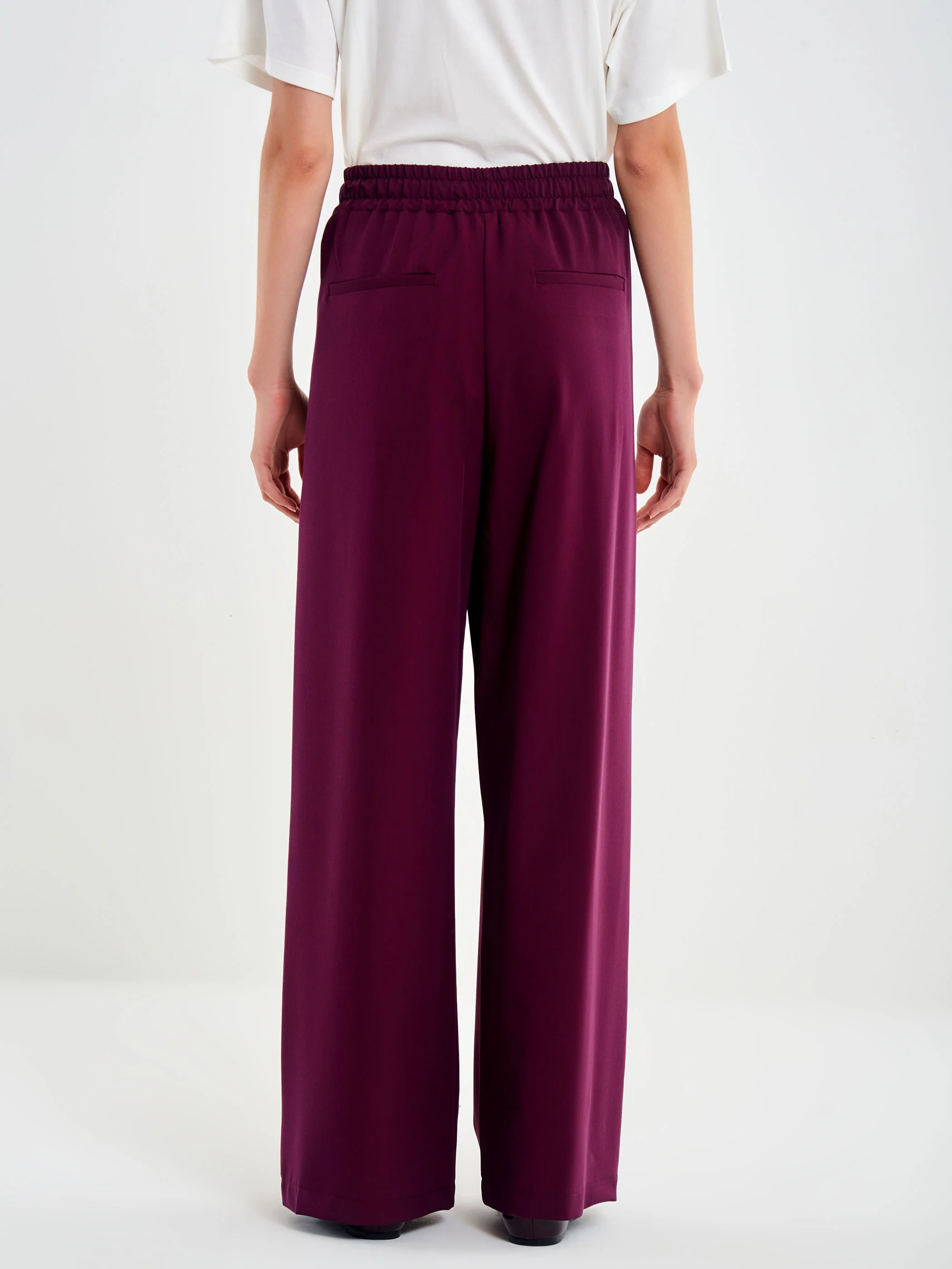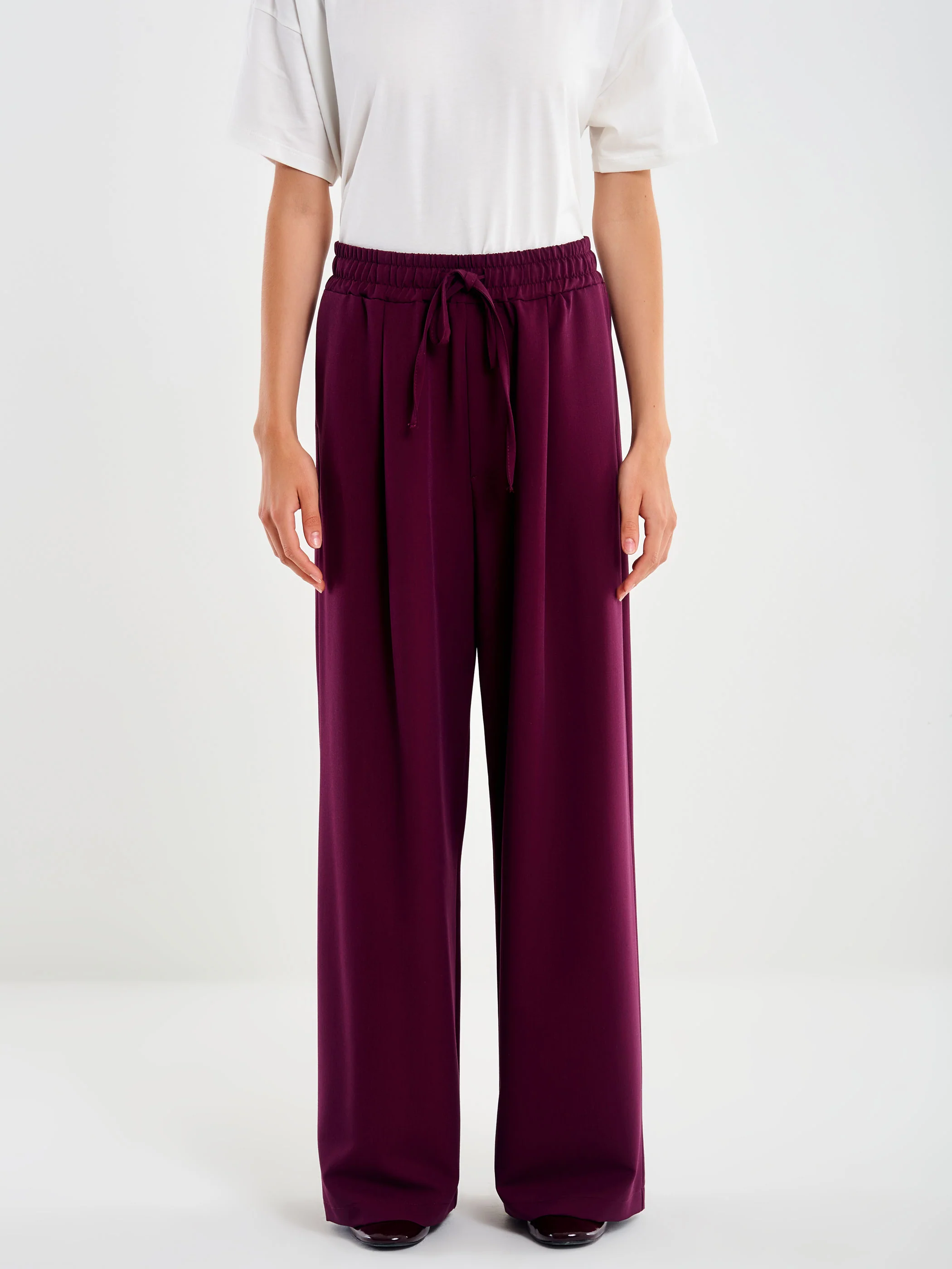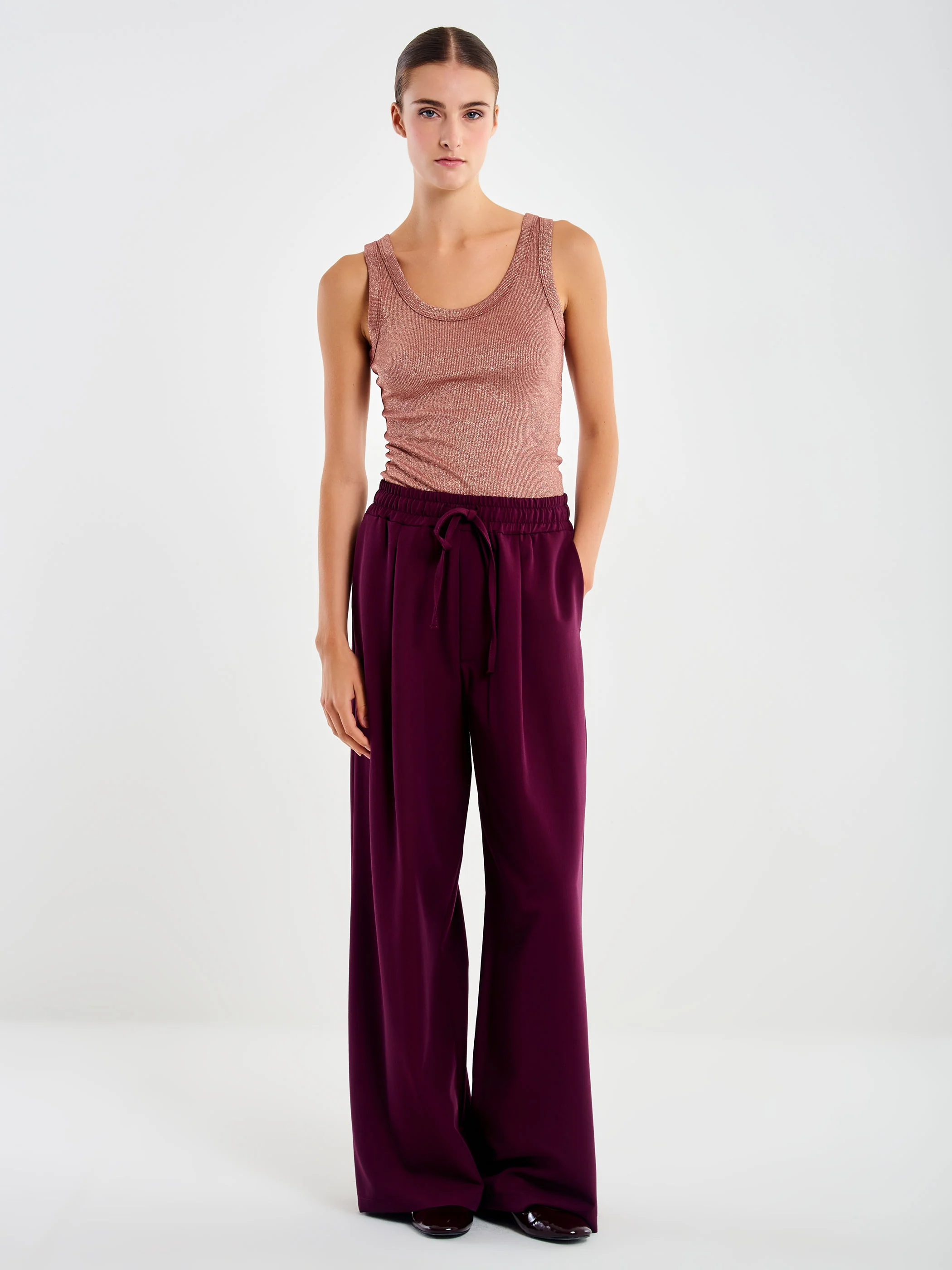 Pantalone ampio con coulisse. Dettaglio Coulisse e laccio in vita. Tasche laterali alla francese.