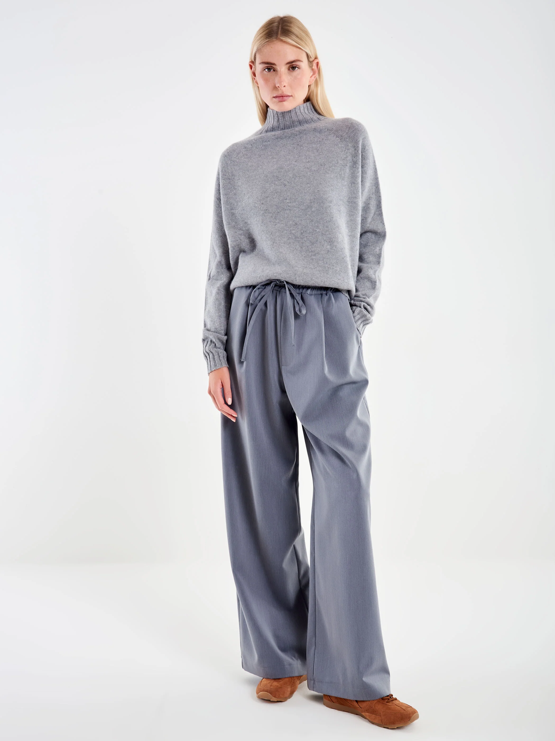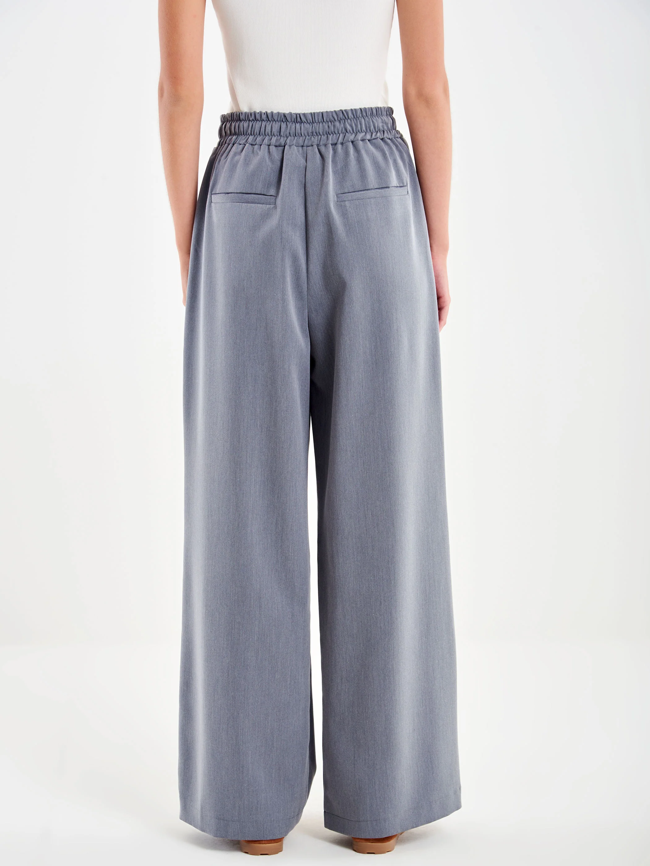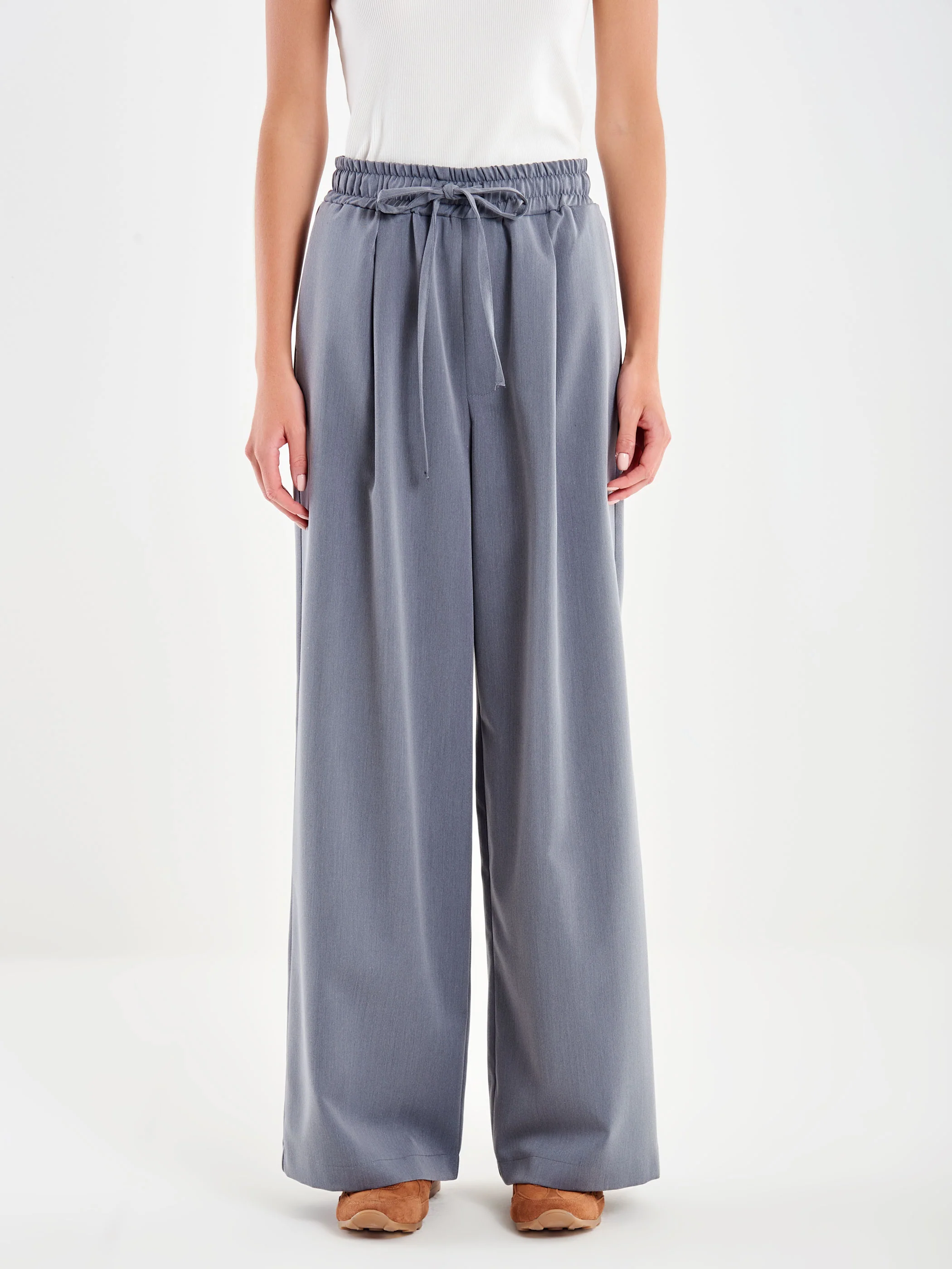 Pantalone ampio con coulisse. Dettaglio Coulisse e laccio in vita. Tasche laterali alla francese.